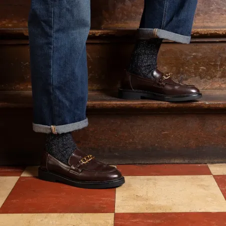Les chaussettes "Torsades" en laine de la Maison Broussaud sont parfaites pour affronter les journées fraîches avec style. Mariage idéal entre chaleur et élégance, elles protègent vos pieds tout en ajoutant une touche sophistiquée à votre look. Le design torsadé de cette chaussette bleu marine et ses paillettes couleur or lui permettent de s'accorder à toutes les tenues. Que ce soit pour une journée décontractée ou une soirée habillée, faites le choix d'une paire de chaussettes confortable, tendance et résistante. Le vrai plus ? Made in France, elle est fabriquée dans nos ateliers au cœur d'un petit village du Limousin.