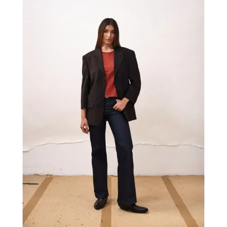 Découvrez Océane, notre jean flare pour femme, à la taille haute et à la coupe évasée, pensé pour allonger la silhouette et offrir une allure affirmée, fluide et structurée.