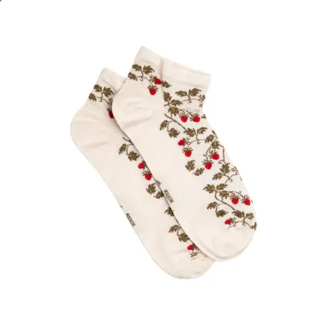 Fruitées et pleines de charme, les chaussettes femme Les Fraises apportent une touche délicieusement colorée au vestiaire du quotidien. Sur un fond écru doux et lumineux, de petites fraises rouges se dessinent en all over, reliées par de fines tiges et feuilles, pour un motif à la fois délicat, poétique et résolument féminin. Un modèle frais et joyeux, parfait pour réveiller une tenue avec subtilité.