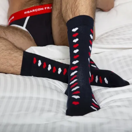 Chaussettes de ville bleu marine, cœurs blancs et rouges.