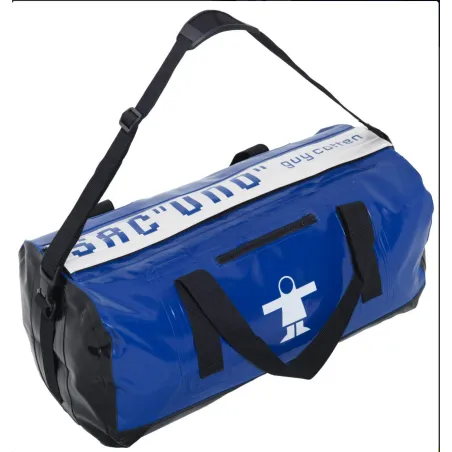 SAC DE NAVIGATION SEMI ETANCHE. Modèle déposé. 60 litres de capacité approximative. Très résistant. Corps du sac étanche. Fermeture maxi glissière sous rabat agrippant. Bandoulière réglable et amovible. Sangle latérale réglable sur un côté pour y glisser, bottes, palmes, duvet.... Poche latérale zippée. Fond lisse. 33X60 cm
