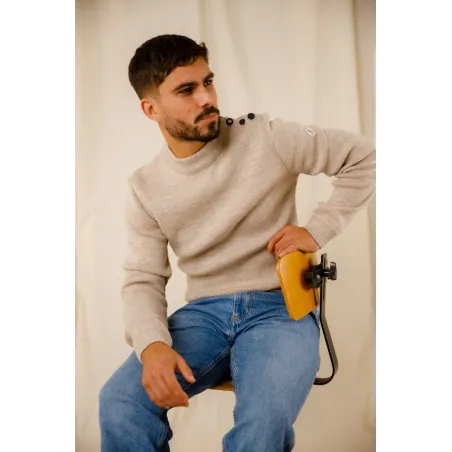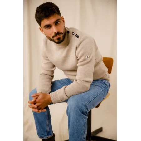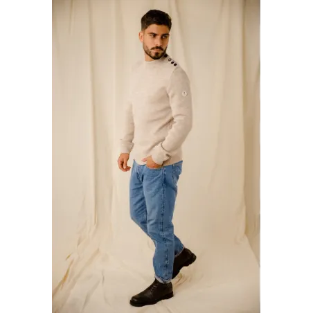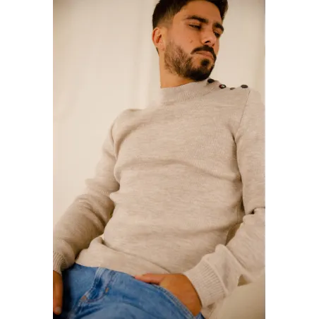Mettez l'iconique Adrian dans votre garde robe. Pull made in France d’inspiration marine en 100% pure laine vierge d'un sublime beige avec une coupe plus droite et plus étroite et un coloris moderne, 3 boutons laqués de couleur marine et un bouton assorti au coloris de la laine.
