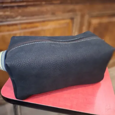 Cette trousse de toilette est en cuir ressourcé. Sa taille confortable a été étudiée pour qu'elle puisse contenir produits de soins, dentifrice et même rasoir ! Pièce fabriquée dans notre atelier du Tarn.