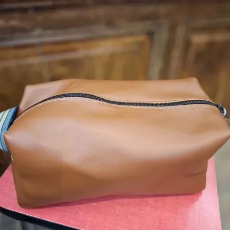Cette trousse de toilette est en cuir ressourcé. Sa taille confortable a été étudiée pour qu'elle puisse contenir produits de soins, dentifrice et même rasoir ! Pièce fabriquée dans notre atelier du Tarn.