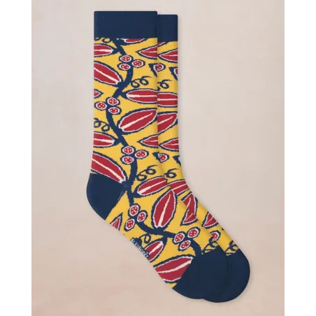 Une invitation au voyage avec ces chaussettes inspirée des motifs des tissus wax africains. Tricotées à partir d'un coton peigné de grande qualité, elles sont douces, résistantes et confortables.