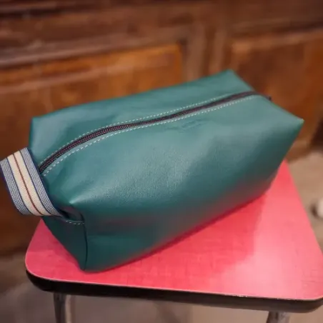 Cette trousse de toilette est en cuir ressourcé. Sa taille confortable a été étudiée pour qu'elle puisse contenir produits de soins, dentifrice et même rasoir ! Pièce fabriquée dans notre atelier du Tarn.