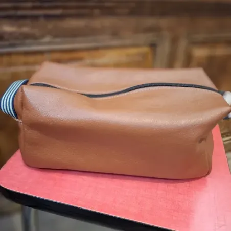Cette trousse de toilette est en cuir ressourcé. Sa taille confortable a été étudiée pour qu'elle puisse contenir produits de soins, dentifrice et même rasoir ! Pièce fabriquée dans notre atelier du Tarn.